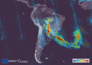 The following image is an artist’s impression of how the Copernicus Sentinel-5A spectrometer would observe aerosol values over South America during a fire crisis.