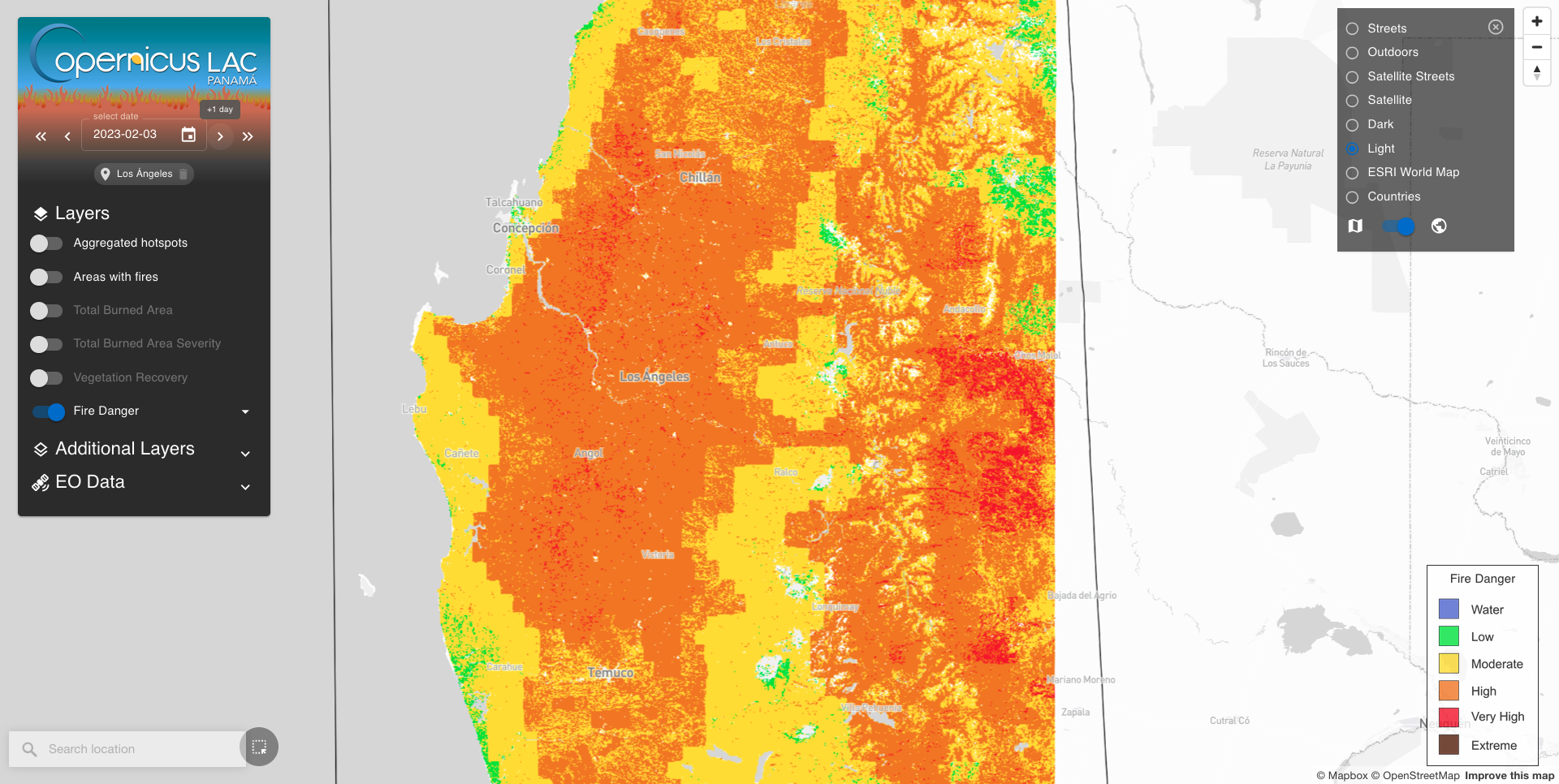 Además, los servicios sobre incendios forestales se centran en apoyar la gestión del riesgo mediante la detección, monitoreo y análisis de incendios activos, peligro de incendios y recuperación posterior al desastre. Uno de estos productos es el Servicio de Mapeo de Peligro de Incendios, que proporciona un índice cualitativo de peligro por píxel analizado mediante la combinación de variables ambientales clave para la ignición y propagación del fuego. Este servicio ha completado con éxito su fase de desarrollo y actualmente se encuentra en su fase de demostración.