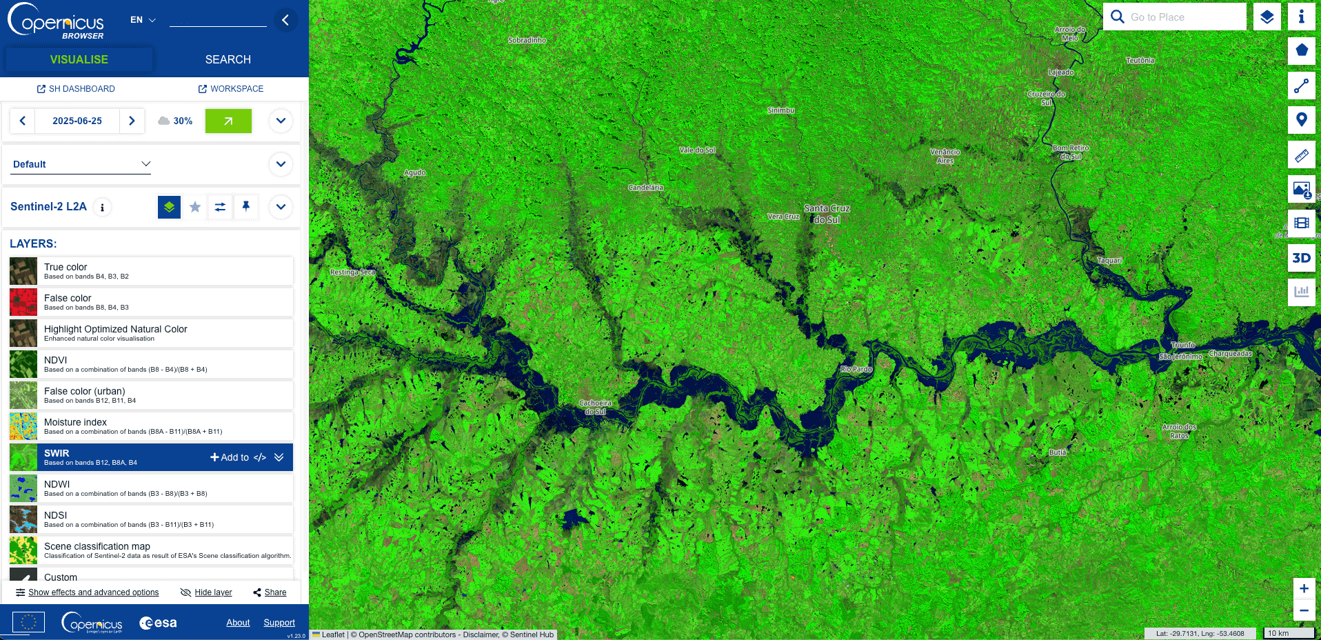 Los datos ópticos del nuevo Copernicus Sentinel-2C son fundamentales para la vigilancia de incendios forestales, sequías, cambios en las masas de agua e inundaciones. Desde su reciente lanzamiento, ya ha contribuido a la vigilancia de acontecimientos importantes en la región de América Latina y el Caribe, como las inundaciones que se produjeron en junio de 2025 a lo largo del río Jacuí y en la ciudad de Porto Alegre, en Brasil.