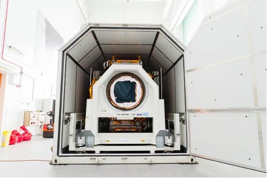 Copernicus Sentinel-1D en su carcasa protectora antes de su envío desde las instalaciones de Thales Alenia Space en Cannes. Crédito: ESA-P. Sebirot