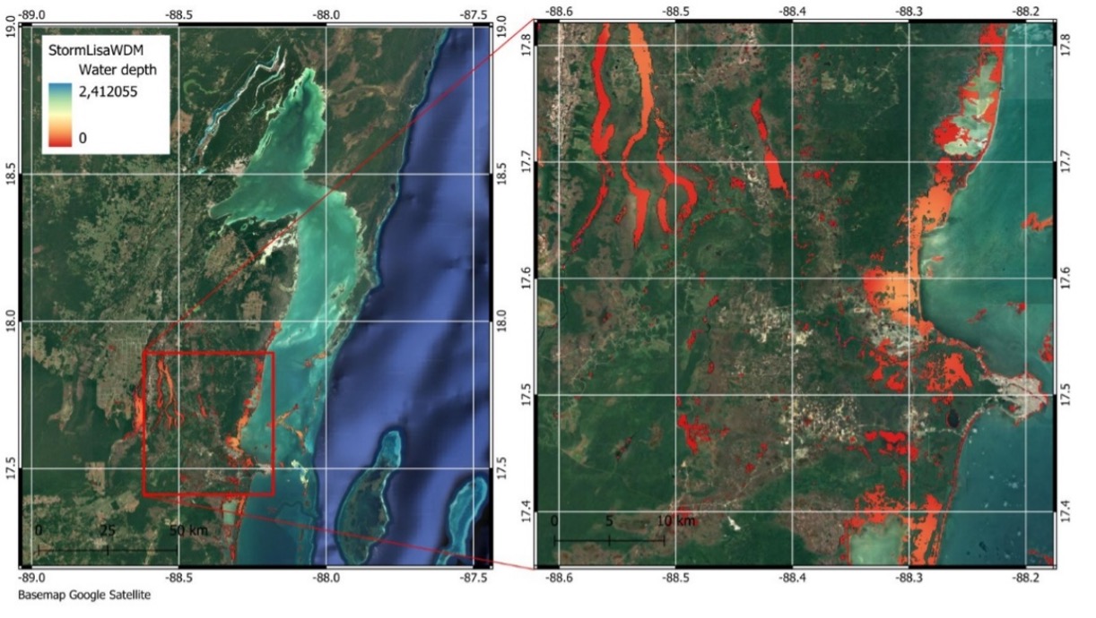 Mapa de profundidad del agua derivado de datos de Sentinel-1 que muestra las inundaciones en Belice el 11 de marzo de 2022. Crédito: Plataforma CopernicusLAC.